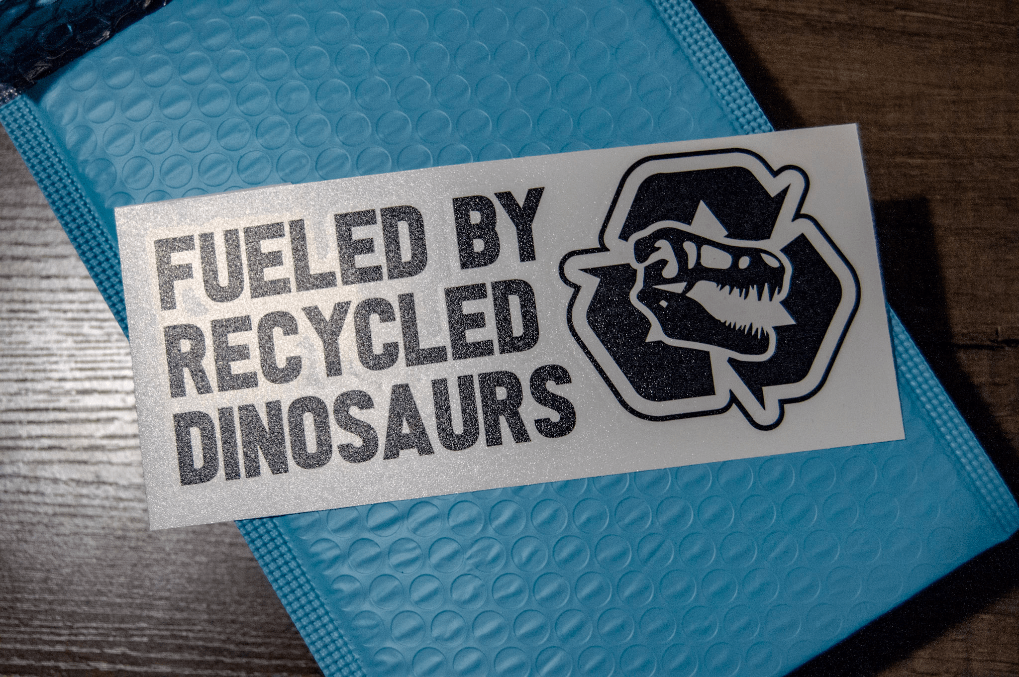 Just another vehicle fueled by recycled dinosaurs. Multiple size and color options available. Made to order. Die cut vinyl decal.