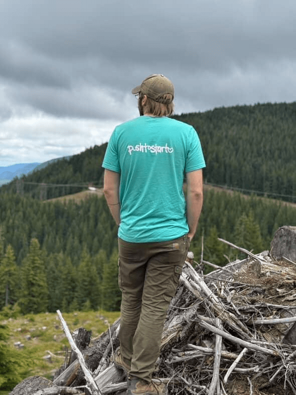 *Two photos show the Heather Black shirt worn by model Augie ig@pnwmiat. Augie is 5’8″ and wearing a Large.